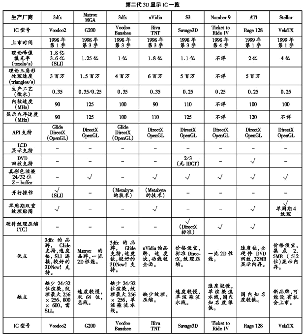 1999年初开始上市的第三代3D芯片产品,虽然从技术上与上一代并无本质的区别,但从性能上却迈了一个台阶。3dfx的Voodoo3最早出现,速度仍旧一流,但不支持新一代产品均有的真彩色渲染和高位数Z-buffer;nVidia的Riva TNT2,具有完善的3D功能和一流的速度,并受到了广泛的支持; S3公司再接再厉,很快又推出了价廉物美的Savage4系列,可惜64位的显示内存降低了性能;Matrox也不甘人后,又设计出图形质量超群的G400及其MAX版,成为niva TNT2的强劲对手;迟迟推出的3Dlabs Permedia3虽然不再有最高的性能,但保证了专业设计市场的基本需求;ATI的增强型Rage 128 Pro更进一步提高了性能。