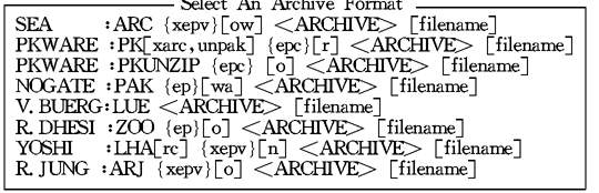 用户输入每个压缩软件的文件名后,AT.EXE接着会要求你给出该压缩软件正确的命令格式,用户应从它列出的几种方案中选择一种正确的命令格式以便AT.EXE利用该格式加以正确的调用,选择命令格式的界面如下所示,用户只需用回车键加以选择即可。