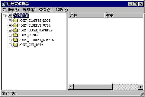 从图中可以看出,注册表编辑器与资源管理器的界面相似,在菜单之下是两个窗格,而数据的组织也与资源管理器类似。左面窗格中,由“我的电脑”(My Computer)开始,以下是六个分支,每个分支名都以HKEY开头,称为主键(Key),这相当于资源管理器中的文件夹,表示主键的图标与文件夹图标一样。每个主键图标的的左边有一个加号(+)图标,单击这个加号可将这一分支展开,展开后加号变为减号。可以看到主键下面还包含次级主键(Subkey)。当单击某一主键或次级主键时,主键名左边的文件夹图标变为打开状,右面窗格中的内容会发生相应的变化,右面窗格显示的是所选主键内包含的一个或多个键值(Value)。键值由键值名(Value Name)及键值数据(Value Data)两部分组成,这就是右窗格中的两个列标(名称(Name)、数据(Data))所表示的。