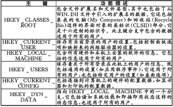 注册表中的每个分支中保存有该计算机中软硬件设置中某一方面的特定信息与数据。表中列出每个主键分支的说明。