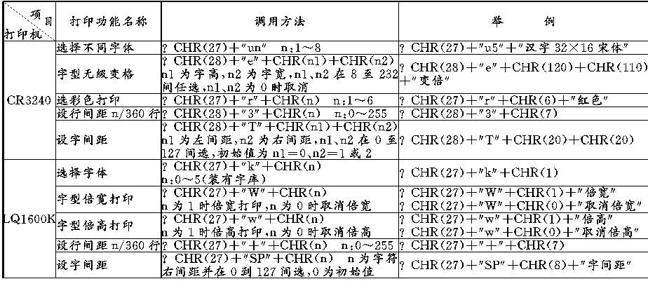 CR3240与LQ1600K打印机是两种常用的打印机,掌握它们的常用打印功能会给我们编程带来方便。笔者根据自己使用FOX系列语言调用CR3240、LQ1600K打印功能的实践,将两种打印机的不同调用方法列表介绍如下,初学FOXPRO编程者不妨一试: