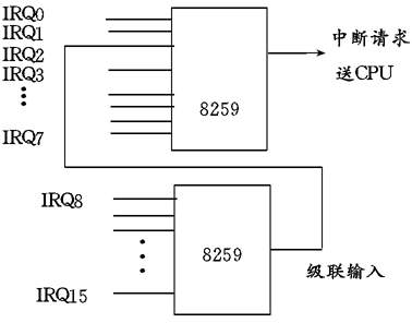 两片8259之间用级联的方法连接起来,即一片8259的输出连接到另一片8259的输入端。因此实际可以使用的中断通道只有15个。
