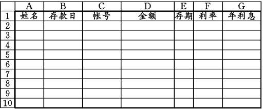 1.单击“日常储蓄登记表”标签,在工作窗口内的顶端行依次输入表格的列标题:姓名、存款日、帐号、金额、存期、利率和年利息,使用鼠标选定顶端行,单击“格式栏”中的“置中对齐”按钮,使各列标题位于其单元格的中间。
