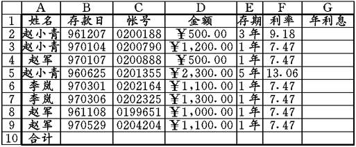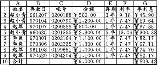 如果我们需要将家庭中个人存款单的有关数据,输入到“日常储蓄登记”表中,然后对各存款单的年利息进行计算,并对各存款单的金额及年利息进行汇总,可按照以下步骤进行: