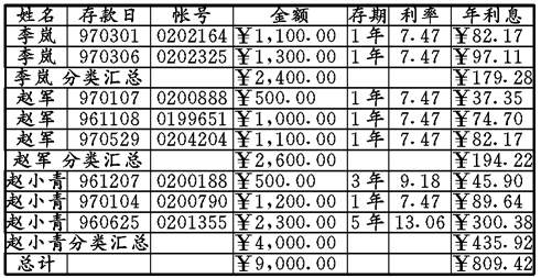 假定我们要对表4按“姓名”对“金额”和“年利息”进行分类汇总,可选定该表(不含合计行),单击“菜单栏”中的“数据”→“排序”,在“主要关键字”下拉列表中,选择“姓名”,按下“确定”键;而后再单击“菜单栏”中的“数据”→“分类汇总”,在“分类字段”下拉列表中选择“姓名”,在“汇总方式”下拉列表中 ,选择“求和”,在“选定汇总项”栏内,选择“金额”和“年利息”,按下“确定”键。分类汇总的结果将显示出来,见表7。