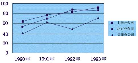 (三)折线图以等间隔显示数据的变化趋势。图三为某大公司的北京、上海、天津三个分公司1990年至1993年纯利润(单位万元)变化的折线图。