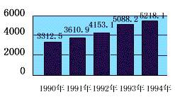 图一为1990年至1994年国家财政收入总额(单位亿元)的二维柱形图。