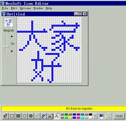 在《电脑报配套光盘第二辑》中有一个专门用来制作图标的软件——Neosoft Icon Editor1.1b,它不仅能制作图标、读取bmp、ico、exe、dll中的图标,而且还能以bmp、pcx、jpg、png、tif的图形格式来存盘,更值得一提的是它还能输入汉字,制作汉字图标。《电脑报配套光盘第二辑》提供了分别安装于Win3.X和Win95的Neosoft Icon Editor1.1b,它能制作32×32像素,16色的图标,这也是Windows支持的图标格式。