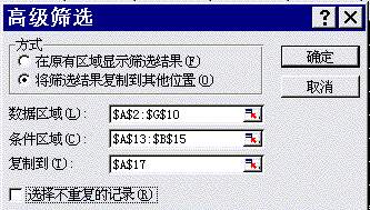 ②在“高级筛选”对话框中选择“将筛选结果复制到其他位置”选项;(不选定此项,筛选结果将在原有区域中显示,此时可用“复制”、“粘贴”的办法来抽取数据);