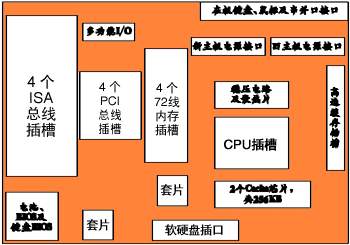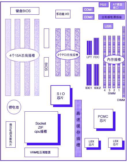 为了叙述起来更清楚,笔者精心制作了3张图,请先看奔腾主机板的结构简图(依据PC CHIPS M520VX套片主机板绘制)。