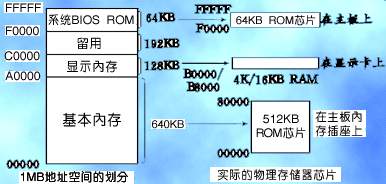 PC机的设计师将1MB中的低端640KB用作RAM,供DOS及应用程序使用,高端的384KB则保留给ROM、视频适配卡等系统使用。从此,这个界限便被确定了下来并且沿用至今。低端的640KB就被称为常规内存即PC机的基本RAM区,请看图1。保留内存中的低128KB是显示缓冲区,高64KB是系统BIOS(基本输入/输出系统)空间,其余192KB空间留用。从对应的物理存储器来看,基本内存区只使用了512KB芯片,占用0000至80000这512KB地址。显示内存区虽有128KB空间,但对单色显示器(MDA卡)只需4KB就足够了,因此只安装4KB的物理存储器芯片,占用了B0000至B10000这4KB的空间,如果使用彩色显示器(CGA卡)需要安装16KB的物理存储器,占用B8000至BC000这16KB的空间,可见实际使用的地址范围都小于允许使用的地址空间。