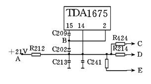 出现水平一条亮线,说明行扫描、行输出部分无问题,估计故障出在场扫描部分。打开机壳,首先找到场扫描部分(由TDA1675及外围元件组成),开机测量TDA1675各脚电压,发现电源供电脚(14)电压不到1V。关机测14脚对地电阻,已短路。检查14脚外接元件,如图所示,首先测A、B、C、D、E点对地电阻,均不为零,说明短路是由C213或C214击穿引起。断开C214,测14脚对地电阻,阻值恢复正常,说明C214已击穿。更换C214后,开机故障现象依旧。再测14脚电压,只有2V左右,而电源输出端(A点)电压为21V,正常。测R212上的电压,竟有19V之多。R212为一功率电阻,其标称值为3.9Ω,焊下测其阻值,已达3KΩ以上。用一只4.7Ω/2W电阻代换后,故障排除。