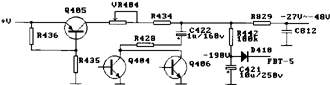 从故障现象看,是关机消亮点电路出了问题,断开电源,打开机壳,未发现电路板上有元件烧损等异常现象。根据电路板绘出该机的消亮点电路如图,估计是FBT的⑤脚负脉冲经整流滤波后的-190V电压没有加到显象管栅极,导致关机后电子束不能立即被截止。怀疑消亮点电路的整流二极管D410或滤波电容C421损坏,焊下测量皆正常,焊下电阻R442测量发现已开路,该电阻正常值为100K,正是此电阻开路,导致-190V电压不能加到栅极所致,更换一只100K/1W电阻后,开机发现无显示,调亮度和对比度皆不起作用,测亮度电位器两端的电压可在0~15V内变化,加到显象管栅极G1的电压可在-27V~-48V内正常调节,可能是栅帘电压太低,适当调节Screen电位器,光栅恢复正常,此时亮度和对比度皆可调,显示器恢复正常工作。