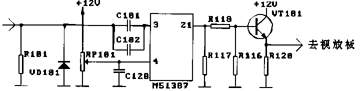 故障分析与处理:打开机器,用示波器直接测量视放板上显像管的(6)、(8)、(11)脚,发现绿色信号明显偏小,而蓝色信号几乎检测不到。视放处理电路部分(核心芯片为M51387)如图1所示(图中只画出了一个通道),(21)脚为蓝色信号输出,经射极跟随器(VT101)后加至视放板。测(21)脚波形正常,怀疑射极跟随器工作不正常。分别测其三极对地静态电阻并与正常的红色通道相比较,发现基极阻值异常。更换一只三极管后,开机,字符呈粉红色,表明蓝色通道已正常。