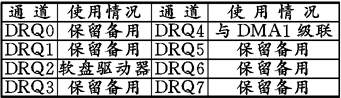 图中DRQ表示由DMA设备向DMA控制器发出的DMA请求信号;DACK为DMA控制器发出的响应信号,表示允许DMA操作;HRQ为保护请求信息号,请求系统总线控制;DMA1的HRQ信号送至MDA2的DRQ4端以构成级联方式。由于级联已经占用了一个通道,所以还剩下七个通道供DMA设备使用。各个DMA通道的分配如下表所示。