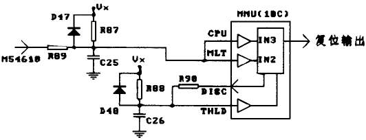 首先检查各路电源输出,未发现任何异常,估计是主板问题。用逻辑笔测CPU地址信号输出脚,无脉冲信号。再测其晶振(30),(31)脚,有脉冲出现,这说明CPU未工作。在开机时,用逻辑笔测(28)脚,发现无复位脉冲。复位电路部分如附图示。测Vx电压,为5.1V,正常。测C26两端电压为零伏。由电路原理分析,Vx电压正常,只有DISC输出低电平,才有可能使THLD端为低电平。测C25两端电压,也为低电平。顺藤摸瓜,最后查出接口芯片M54610P的(2)脚恒为低电平。(2)脚是主机初始化信号输入端,M54610P内部经两级放大驱动后,从(3)脚输出,加至复位电路。(2)脚电平恒低,使CPU复位操作不能结束,CPU不能进入正常工作。检查与(2)脚相连的外围电路,无问题。用万用表测(2)脚对地电阻值,正、反向都只有10欧左右。更换M54610P后,开机,故障依旧。