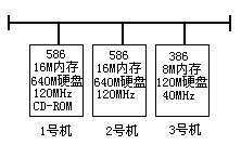 我实验室配备两台586、一台386微机,其中只一台586微机配置了CD-ROM。硬件配置如图1所示。