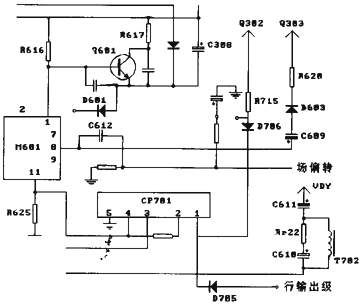 从电路简化图中可得知,M601的8脚输出的场消隐信号经过C609、D603、R620进入亮度放大管Q303的基极。用万用表对其逐一进行检测,发现二极管D603短路。正是因该二极管短路,才会导致电路失去对场消隐脉冲信号的限幅作用,从而出现黑色暗区。拆下D603,更换之,故障排除。