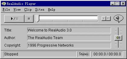 Readl Audio Player的界面简单,和常用的录音机一样,有播放、停止、跳播等功能,感觉如同在操纵一部录音机按键。另外,Real Audio Player也可以帮你找到并记下可以用Real Audio Player方式播放的网址。你也可以将此软件下载,以播放你自己所编的声音文件。