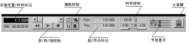 上面是乐曲相对位置滚动条,用鼠标左键点一下前后箭头可前后移动一个小节,而用鼠标拖曳滚动条则可移动到乐曲的任何位置;下面是倒带键、放音键和录音键。按一下倒带键可以停止放音或录音,并一下回到乐曲的开头。按一下放音键,便从当前位置开始放音,再按一下就停止放音。同样,按一下录音键,便从当前位置开始录音,再按一下就停止录音。