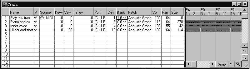它分为左右两个部分。左边是音轨参数部分,右边是小节部分。用鼠标拖曳中间的分隔线,就可调整两个窗口的大小。其中,音轨窗用于修改各音轨的参数,如音轨名称、MIDI通道号、击键力度、音色等等。而小节窗的作用是显示每一轨小节的情况,常用于对乐曲进行裁剪、拷贝、粘贴、移动等操作。