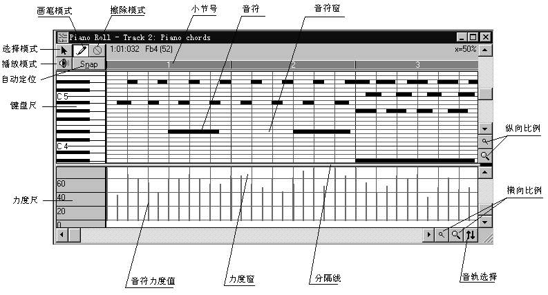 钢琴卷帘窗如图三所示,在该对话窗的上面是音符窗,下面是力度窗。