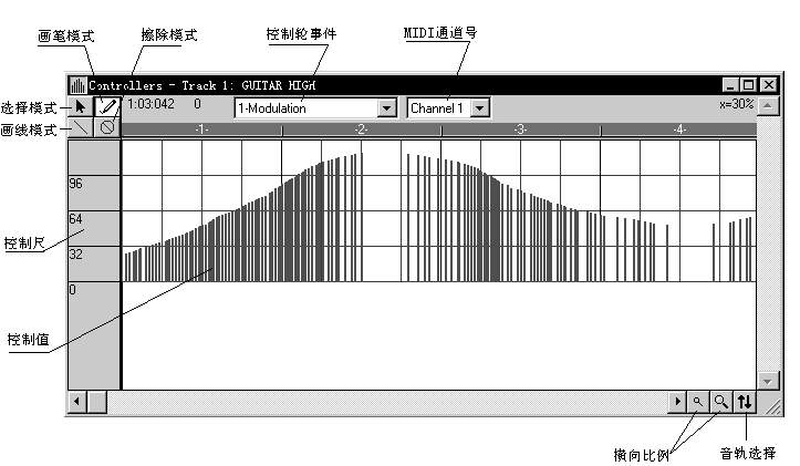在该窗口中横坐标表示小节时间,纵坐标表示控制值。同钢琴卷帘窗一样,控制轮事件窗一次只能显示一条音轨的一种控制轮事件,要选择其它音轨时,可用鼠标点按音轨选择按钮。