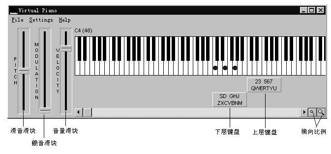 虽然两层键盘组合后也只有两个半八度音程,但可用光标键移动“键盘标记”的位置,每次移动一个八度音程,这样便可覆盖十个八度音程的范围了。其中,“→”、“←”键移动“上层键盘”;“↓”、“↑”键移动“下层键盘”。另外,电脑键盘演奏的好处之一是可以弹奏任意和弦。而用鼠标控制“虚拟钢琴”时,可以不受切换音程的限制,但演奏速度较慢而且不能演奏和弦,因此特别适合演奏大范围的刮奏效果,以及较慢的一些单旋律音乐。