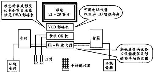 电影的优势是银幕大,画面清晰,音响效果好。那么在家庭之中应如何去模拟影院的效果呢?比较理想的方法是用DVD(图象质量接近电影)影碟、大屏幕彩电和高保真音响去实现,见图1。然而,遗憾的是由于价格和节目版权等原因,DVD影碟目前还无法进入大多数家庭。于是我们用VCD影碟去代替DVD,虽然其图象质量和DVD相比差了很多,但只要我们合理地去配置设备,尽量获取优质图象和音效,也可以创建较为理想的家庭影院环境。