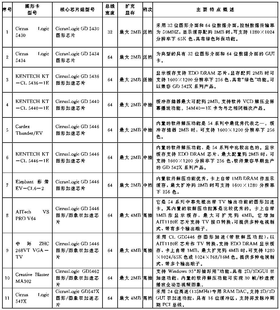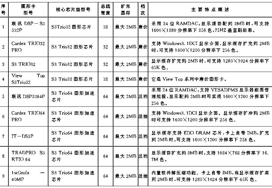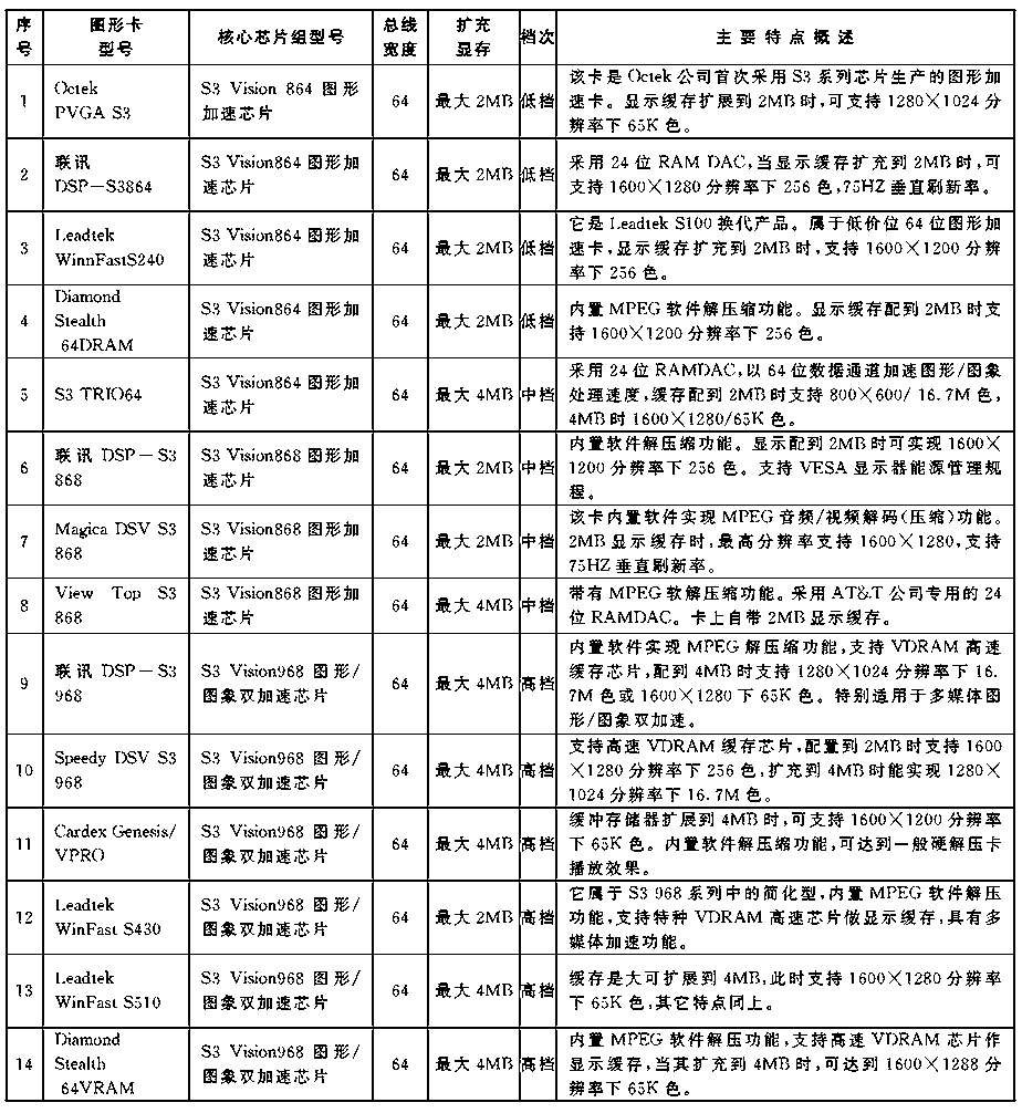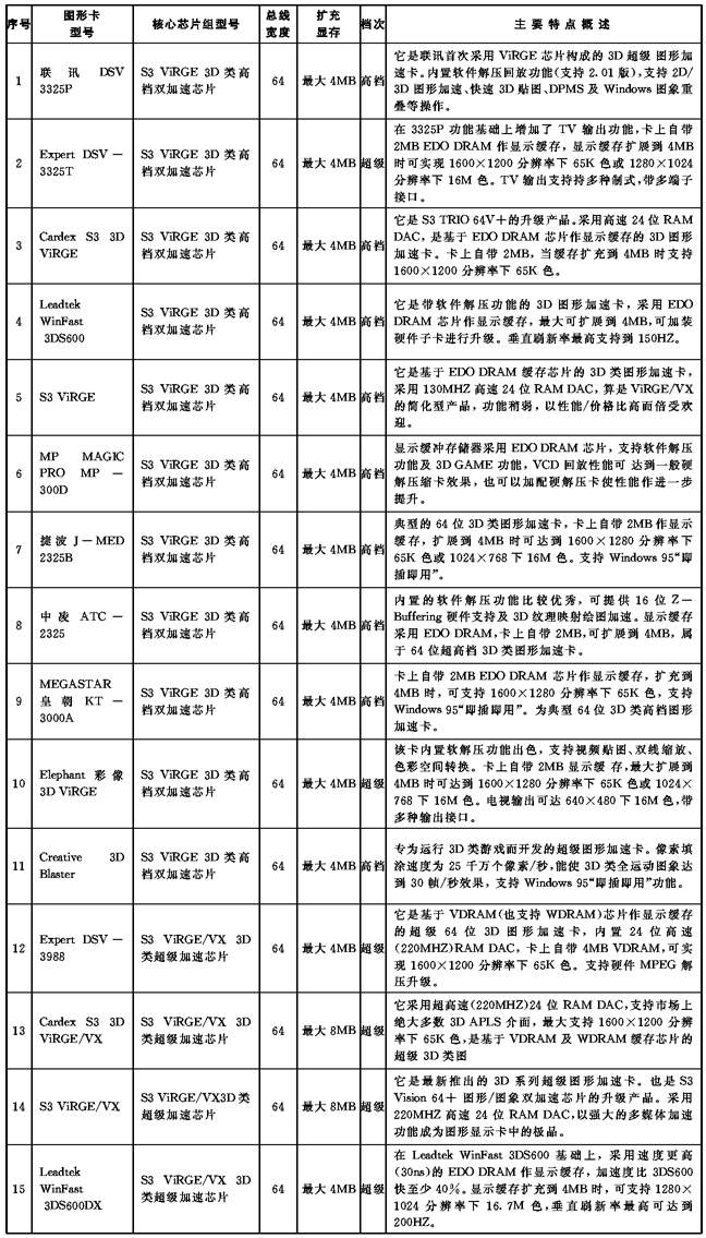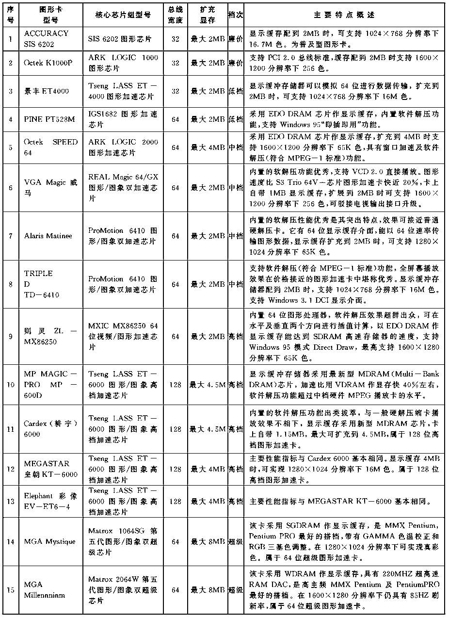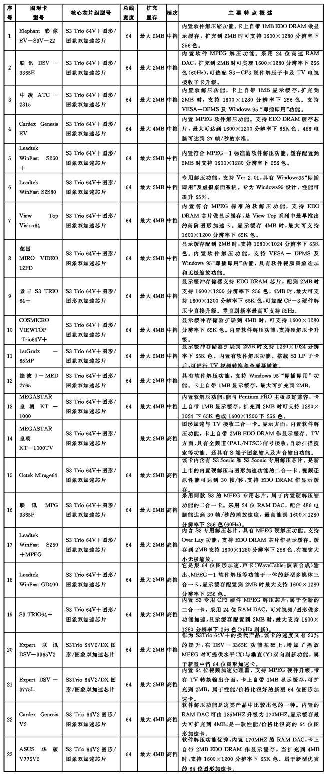 本文含概了国内市场销售的百多种图形加速卡,从100元的普及廉价产品,到3000元的专业超级产品无所不包,可以说集图形加速卡之大全。见表。
