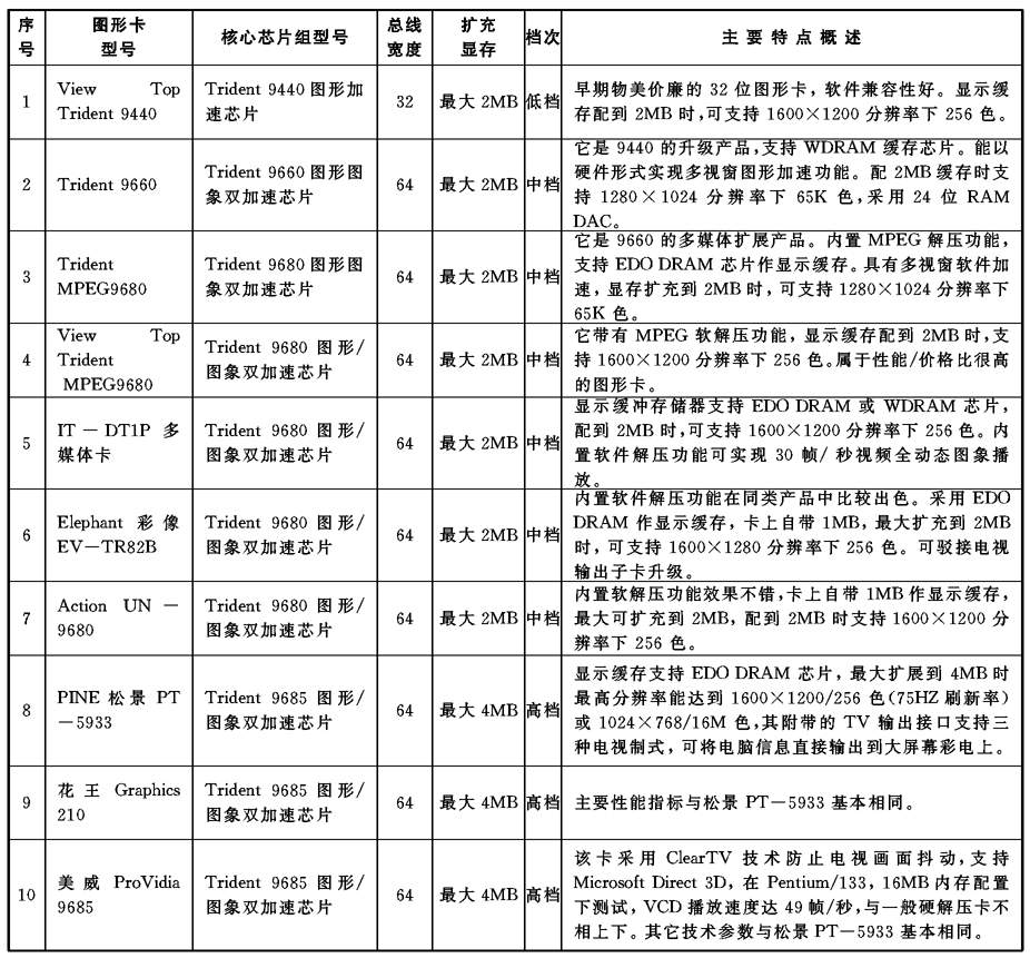 说明:本次列表只是根据所选用的图形(加速)芯片来大致划分为廉价、低档、中档、高档、超级五个等级。应该说很不严格,故仅供参考。