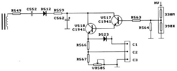 行输出变压器次极绕组整流出来的脉冲电压经C562滤波后加到复合管(由V517、V518组成)的集电极。另外高压输出300M、390K电阴分压后加到复合管的基极,使其导通。这样Ucp加至复合管的发射极,经R566、R567、VR505分压后形成C2电压。参见图3。