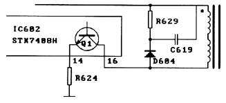 (2)在测量+B2的行输出供应电压时,应断开行输出级负载,用一只220V/60W灯泡作假负载接在C658的两端,以防止IC602内部功率放大管截止时,开关变压器T602中初级绕组贮存的能量无处释放而产生过高电压击穿IC602内部功放管。