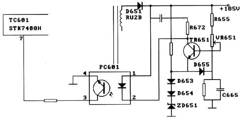 用示波器继续检查有关各关键元件的波形,发现PC601的2脚波形也有跳跃点。这时,调整VR651,电压能改变,但故障依旧。注意,检修过程中不要断开PC601的各脚,否则会有危险的电压输出!估计PC601内部三极管不良,用新品换后故障即可排除。