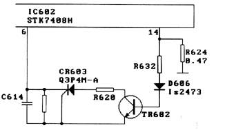 IC602内部功率放大管的发射极接R624至地。正常电流下,R624上的压降不足使V602导通。当某种原因使流过功率放大管的电流异常增大时,R624上的压降也增大,超过一定值时V602导通,CR603的控制端G极被触发,A、K端接通,IC602的6脚电位上升,流过功率管V5的电流减少,保护了功率管不被烧毁。