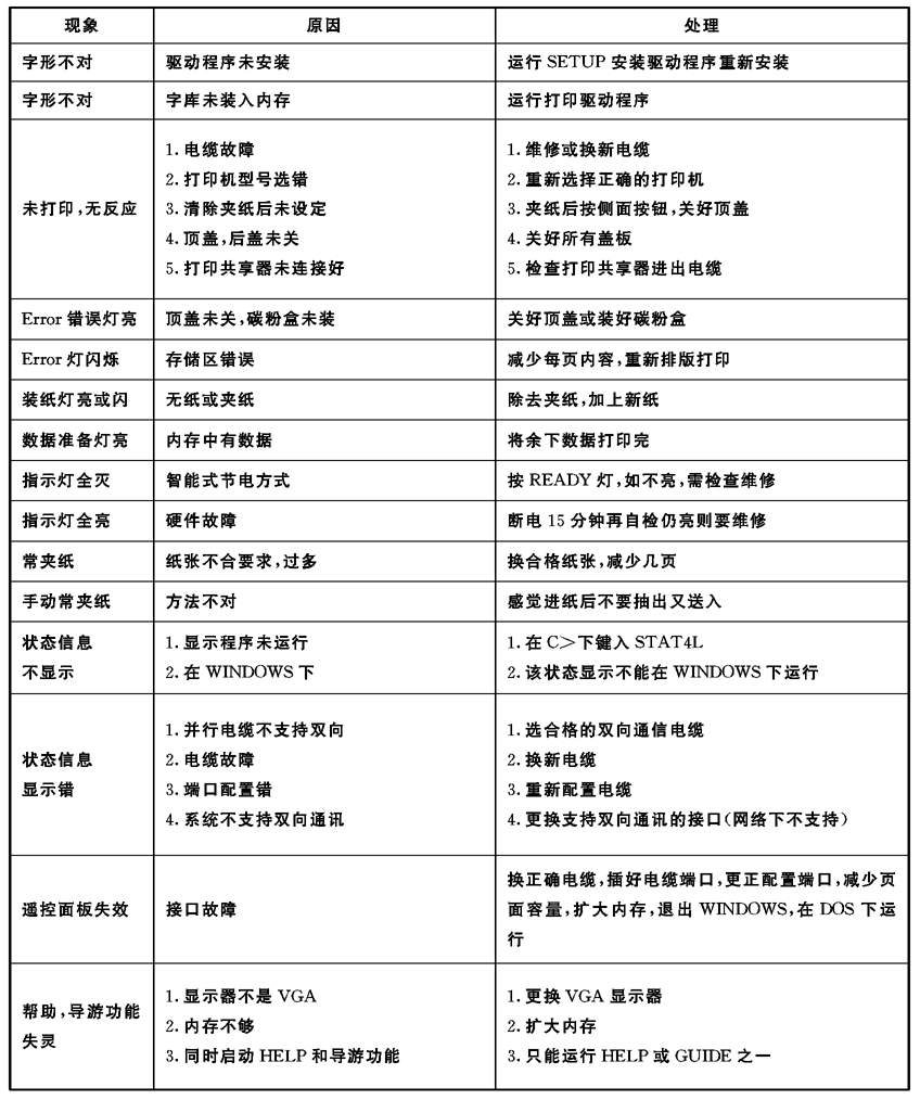 常用的激光打印机之一般性故障见表二 。