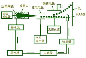 工作时,导电的墨水在墨水泵的高压作用下进入喷嘴,通过喷嘴形成一束极细的高速射流。射流通过高频振荡发生器断裂成连续均匀的墨水滴流。在充电电极上施加一个静电场给墨水滴充电,所充电荷多少与墨喷在纸上的位置高低成正比,在充电电极上所加的电压越高,充电电荷就越多。带不同电荷的墨滴通过加有恒定高压偏转电极形成的电场后垂直偏转到所需位置,电荷一直保持到墨滴落在记录纸上为止。若在垂直线段上某处不需喷点,则相应的墨滴不充电,这些墨滴在仿转电场中不发生偏转而按原方向射入回收器中。