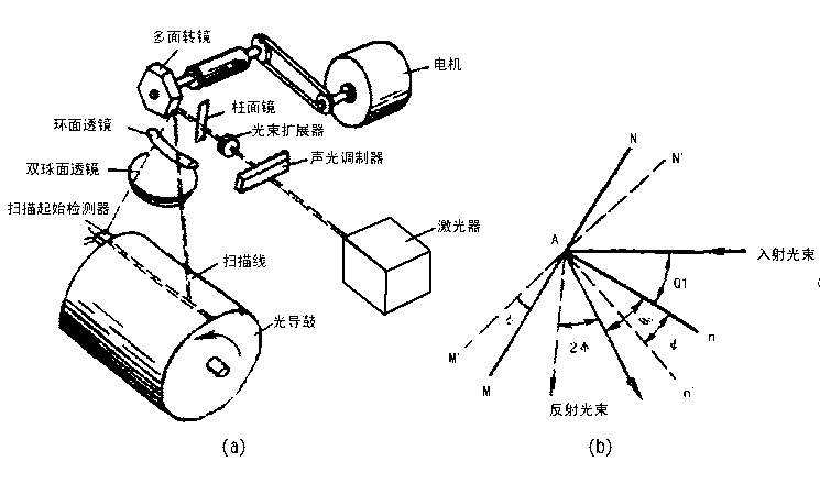 在图7(b)中,MN为多面镜的一个面。当入射到MN上时,若入射角为Qi,则反射光束以反射角Qd反射出来。显然,Qi=Qd。若MN转过一个角度Φ,而入射光束方向不变,则反射光束转过2Φ,或者说,反射光线经镜面MN的两倍角速度旋转。当反射点到感光鼓的距离足够远时,反射的激光束就能从鼓的一端扫描到另一端,图(a)说明了这一工作过程。