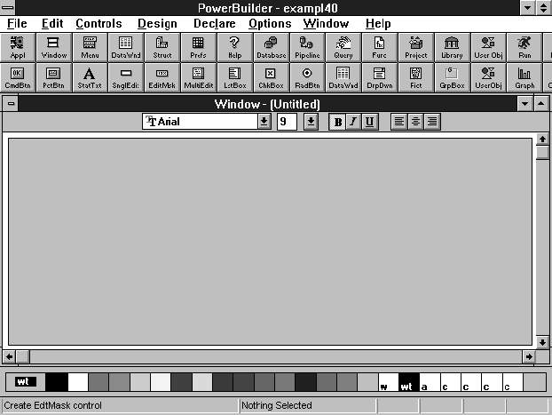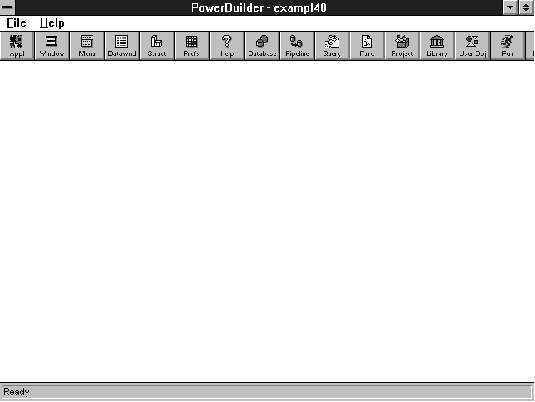 从 Windows 3.x下进入PowerBuilder后,PowerBuilder打开它的主窗口,里面包含一个菜单栏和一个画板(Power)栏(见图1),可以单击画板栏上的某个图标或从菜单里选取一个菜