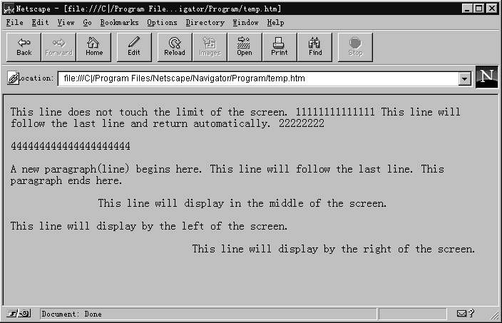 9:<P ALIGN = LEFT>This line will display by the left of the screen.</P>