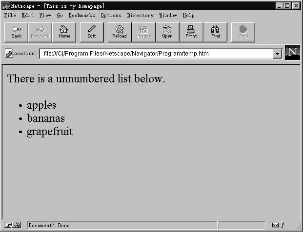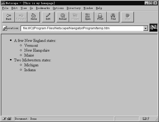 在超文本中的列表有三种,无序号列表、序号列表和定义性列表。首先介绍无序号列表,它使用的一对标签是<UL></UL>。在这对标签作用的范围内,每个列表项前使用标签<LI>表示,且无须</LI>标签作为照应。下面例子的实际效果见图5。