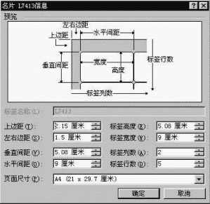 对话框的上部是图示,而下部为具体数字。可根据纸的规格和名片大小,计算一下。通常市场上可以购到的名片纸的规格都是A4,这里对纸张的设定是合适的。但名片大小好像与我国习惯不符,可进行修改。我国大多数名片的大小为8.5厘米×5.5厘米。我们可以将“标签高度”框中的数字改为5.5厘米,而将“标签宽度”改为8.5厘米,“水平间距”框中的数字可保持不变,这样两列为18厘米,A4纸的宽度为21厘米,每边还能有1.5厘米的页边距。对于各种打印机来说,都不会产生打印不全的问题。A4纸的竖向大小为29.7厘米,如果标签高度为5.5厘米,则可设水平间距为6厘米,这时每页五行标签可能就放不下了,可将“标签行数”框中的5改为4,上下还有一定的页边距。这一修改过程的结果可从图3 上部的图示中反映出来。由于修改了原来的L7413规格,所以这时应在图3中部的“标签名称”框中为新定义的标签输入一个名字,比如可叫“我的名片”。Word会将此名称及其规格保存起来,以备将来使用。因此定义好的标签具有模板性质,可反复使用。