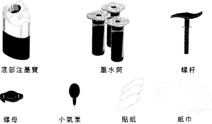 4.当活塞到达墨水筒底部时,停留30秒钟左右,将螺杆反时针方向旋转数圈,使活塞弹起。取出墨水筒,打开底部注墨宝的面盖,取出墨盒。螺母及螺杆可下次使用。