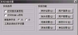 单击“功能”按钮将显示如图四所示的对话框。其中包括“系统选项”和“系统功能”两部分。“系统选项”中包括了对单证的特殊要求和工具条滚动文字的设置。“系统功能”包括以下几项: