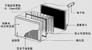 2.“未来窗”显示器一改通用的柱状荫罩板技术,采用独特的平面荫罩板(如图2),让荫罩板与显示屏间的距离缩小到仅4毫米,并且荫罩板又采用沟状栅栏结构,大大提高了开口率和透过率,缩小了点距,使得显示的画面更清晰,色彩更鲜明,而且从任何角度看,画面都没有扭曲或变形。