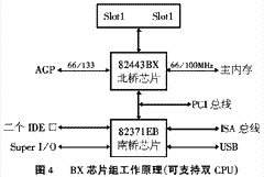 我们先以Intel目前的主流BX芯片组为例加以介绍。它由两枚芯片组成,在主板上就是标有“AGP Set”的那枚,学名“82443BX”,芯片上面还刻有出厂编号, 、产地等。它负责CPU、内存、AGP、外频的产生以及与南桥芯片的联系与调度等,可以说是重中之重。因为它功能如此复杂,所以芯片面积很大,采用BGA封装,共有496个引脚。主板的南桥芯片——8Z371EB任务相对要轻一些,它一般与外部设备打交道,如USB、ISA以及PCI到ISA的联系等,它的功能较少所以晶体管数量也少,面积比北桥小得多,引脚也只有324针,它还有个俗名叫“PⅡX4”。(Intel 82443BX芯片组工作方式见图4)。