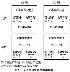 主板Socket 7平台上的当红小生非VIA MVP3莫属。大家现在见到的MVP3芯片组主要有“CD”版和“CE”版两种,从北桥芯片上标有的字样即可看出,如果是 “CE”版则第一行有“VT82CS98 MVP”,如果是“CD”版则是“VT82C 598AT”,而第二行更是(“CD”版与“CE”)版图案见图5)一目了然。