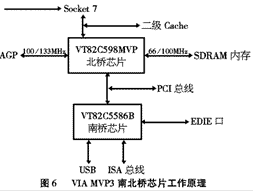 “CE”版芯片的性能当然比“CD” 版要好,至少“CE”版芯片在支持i740显示卡上基本没问题,而“CD”版则麻烦较多。与Inte l的BX芯片组不同,MVP3并没有都采用BGA芯片,它的北桥是BGA封装的,而南桥仍采用FQFP,看上去两枚芯片一圆一方,不过从功能上说它不亚于BX芯片组,其南、北桥芯片所掌管的主板部件以及工作方式和“BX”也相差无几,只不过MVP3的北桥芯片还担负着“PCI TO IDE”的艰巨任务(MVP3工作方式见图六)。