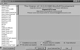 如果我们的电脑被特洛伊木马潜入,那是一件非常危险的事情,我们上网毫无安全保障,随时都有受人控制的危险。有什么办法可防止这类事情的发生呢?第一不要随便运行来历不名的软件,第二安装查杀特洛伊木马的软件。这类软件很多,这里介绍的The Cleaner2.1就是其中的一种。它的功能最强大,查杀的各类特洛伊木马种类最多,可多达100多种!其中很多种我们大多数网友听都没听过。我手上的版本为2.1.0.2,也是最新版本。有了它我们可以将电脑“清洁”得干干净净,放心大胆地上网。下面我们就来看看它的强大功能。