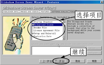 8.功能设置,设置屏保安装程序(图10):这一步设置较为复杂,主要是为你的屏保设计自动安装程序。专业的屏保程序,都可以自动安装,主要就是为了方便传播、发表。通过选择项目栏中的复选框,依次可以为自己的屏保选择“自定义预览”、“启动顺序”、“背景音乐”、“辅助说明文件”、“授权协议文件”、“安装和卸载”和“终止日期”等。这里我们选择“Background Sound”(背景音乐)、“Setup and Uninstall”(安装与卸载)。注意,如果选择了其他项目,则在后面将有相应的设置步骤。